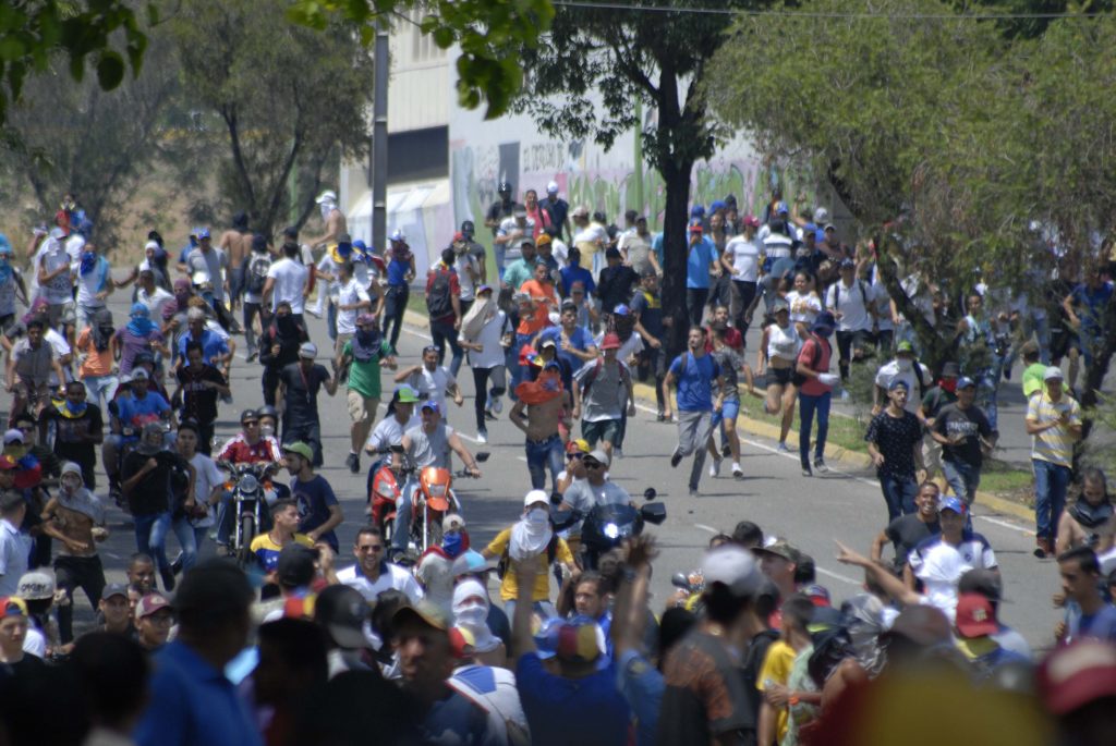 Consignas, calor y solidaridad entre los asistentes, conformaban un ambiente alegre. Al fondo se escuchaba “autopista,autopista,autopista”; pasado el mediodía, la bajada de kilómetro y medio fue colmándose de personas decididas a llegar hasta la Autopista del Este, donde fueron recibidos por las bombas lacrimógenas disparadas por la Guardia Nacional Bolivariana que lograron dispersar a medias a la manifestación.